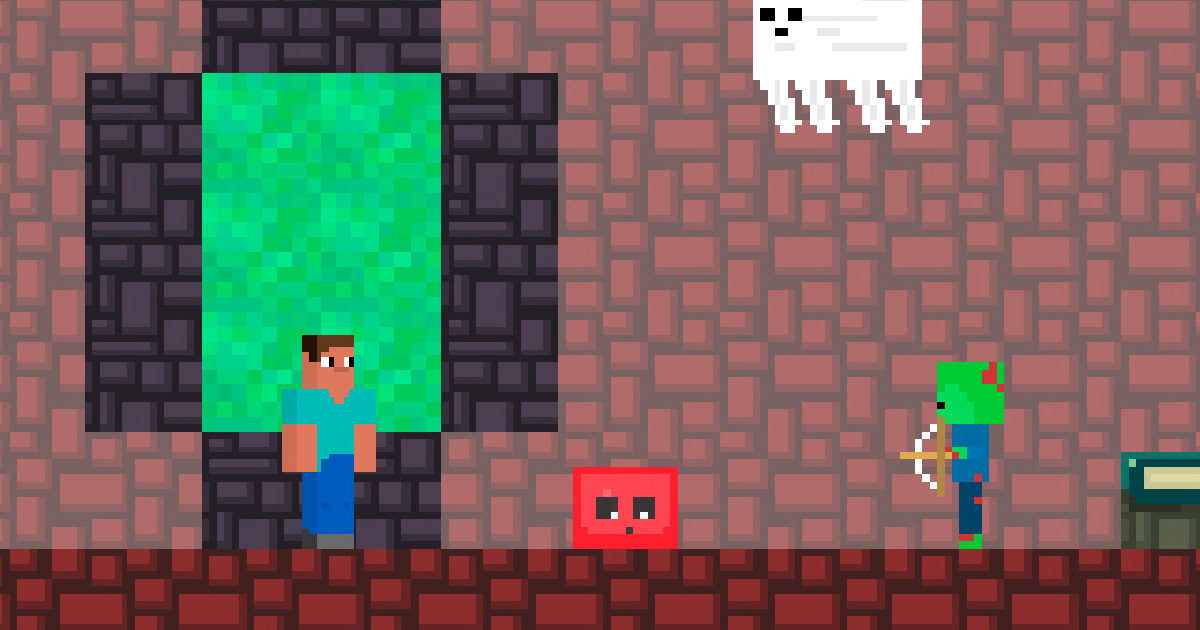 You need to assist the adorable Steven in navigating through the portal and arriving at the green chest in the crimson darkness. What are you hesitating for? Lend a hand and guide Steve to the ballot box. Exercise caution now, as more perilous flying creatures, slimes crawling on the surface, and zombies launching arrows are anticipating your arrival.